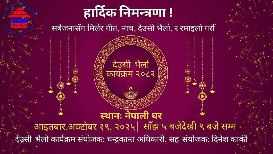 यसैगरी नेपाली सास्कृतीक केन्द्र नेपाली घरमा नेपाली घरका बोर्ड अफ डिरेक्टर चन्द्रकान्त अधिकारीको संयोजन तथा कल्चर एण्ड ईभेन्ट अफिसर दिनेश कार्कीको सह संयोजनमा अक्टोवर १९ तरिक आइतबार सांझ ५ बजेदेखि ९ बजेसम्म देउसी भैलो खेल्ने कार्यक्रम रहेको नेपाली घरका अध्यक्ष बसन्त लम्सालले बताएका छन् ।