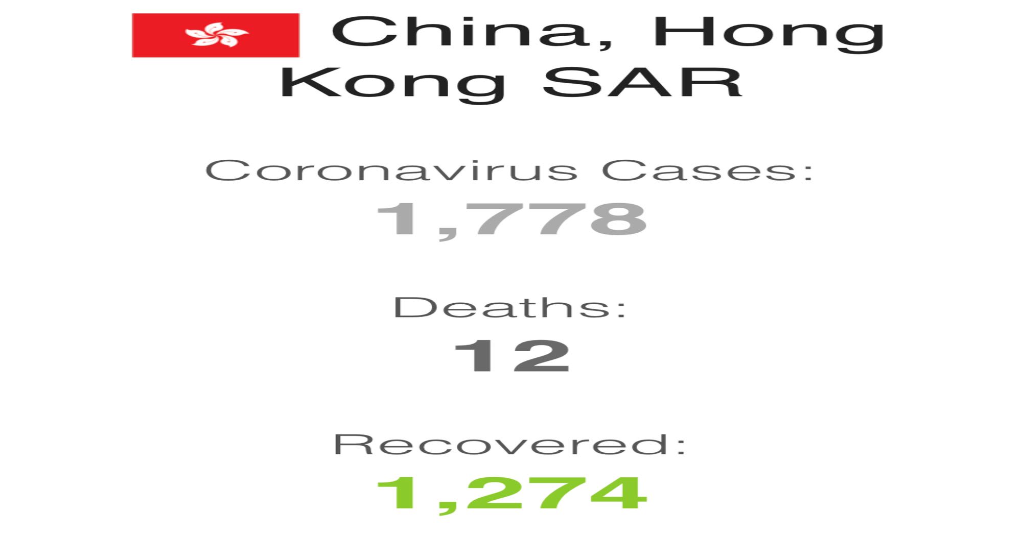 हाल सम्म हङकङमा कोरोना संक्रमितहरुमा १,२७४ जना कोरोना जितेर अस्पतालबाट डिस्चार्ज भएका छन्। ४२१ जनाको उपचार भइरहेको छ। १३ जना संक्रमितको अवस्था गम्भीर रहेको जनाइएको छ। कोरोनाबाट हङकङमा हाल सम्म १२ जनाको ज्यान गएको छ।
