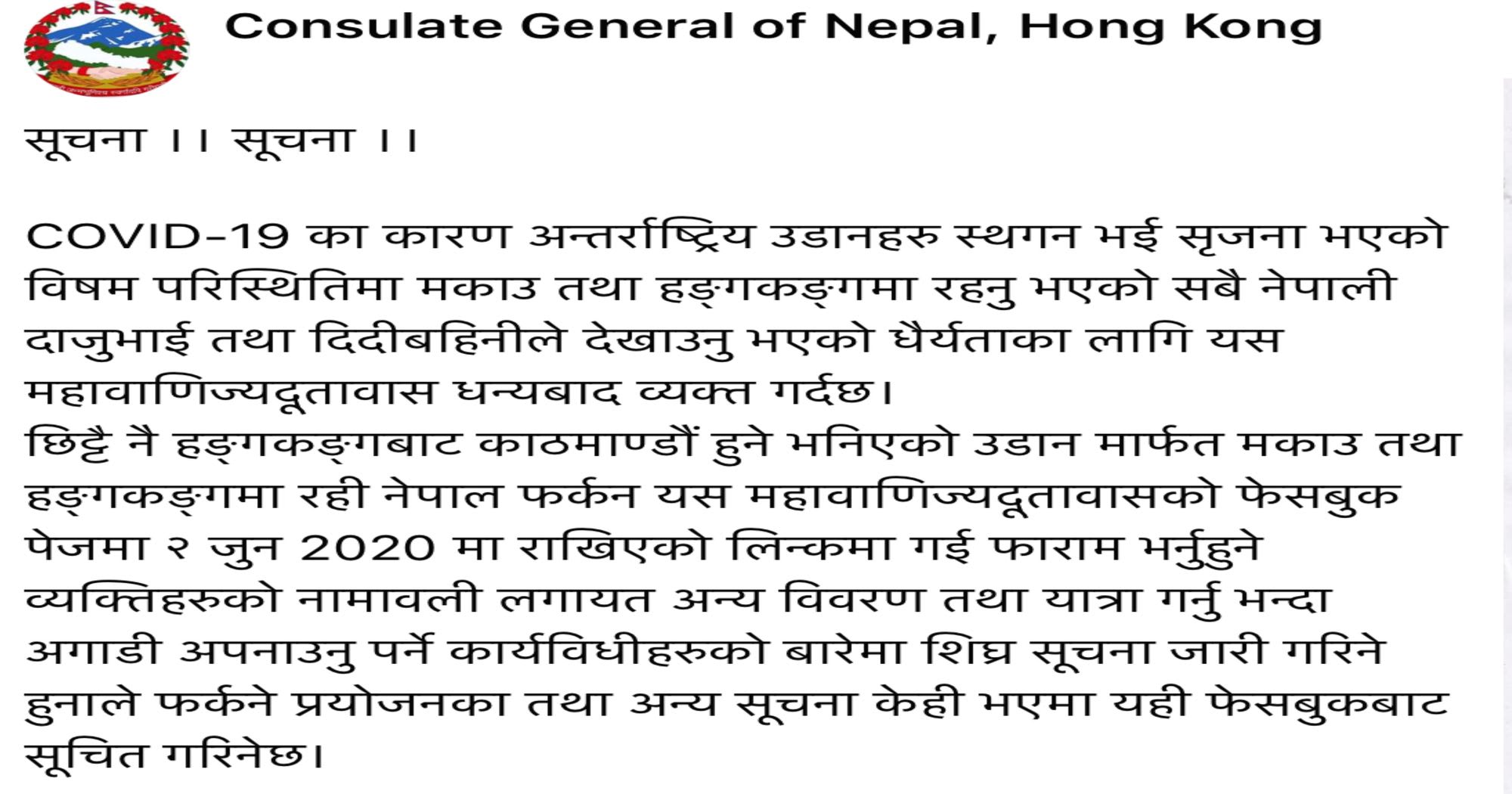 छिट्टै नै हङकङबाट काठमाण्डौं हुने भनिएको उडान मार्फत मकाउ तथा हङकङमा रही नेपाल फर्कन यस महावाणिज्यदूतावासको फेसबुक पेजमा २ जुन २०२० मा राखिएको लिन्कमा गई फाराम भर्नुहुने व्यक्तिहरुको नामावली लगायत अन्य विवरण तथा यात्रा गर्नु भन्दा अगाडी अपनाउनु पर्ने कार्यविधीहरुको बारेमा शिघ्र सूचना जारी गरिने हुनाले फर्कने प्रयोजनका तथा अन्य सूचना केही भएमा यही फेसबुकबाट सूचित गरिनेछ।” यसरी दूतावासले सूचाना जारी गरेको हो ।