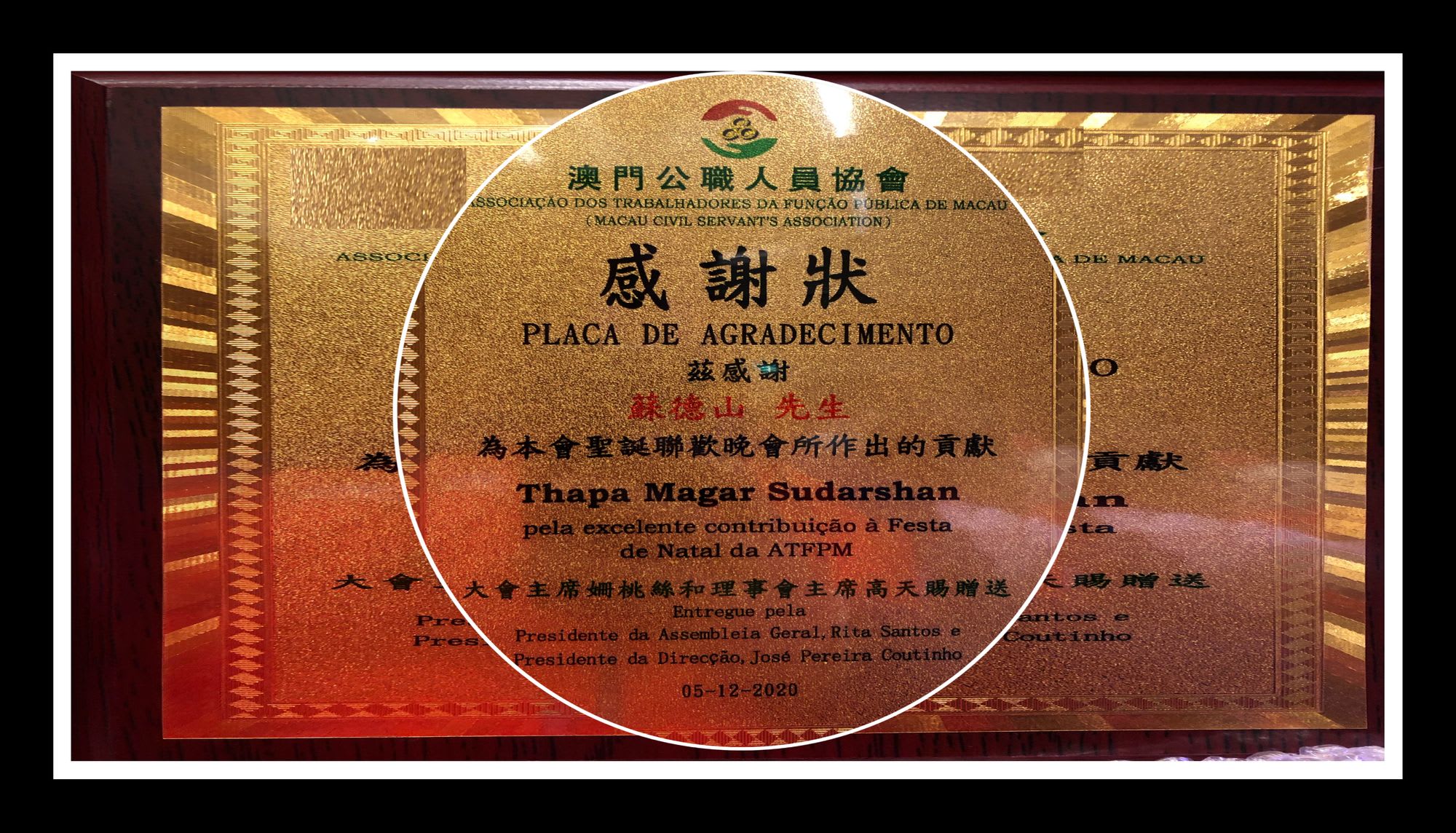 सन्जिब कोयी, मकाउ - मकाउका चर्चित “मकाउ सर्भेन्ट एसोसिएशन” (एटीएफपीएम) मकाउद्वारा नया वर्ष तथा मेरी क्रिसमसको पूर्व सन्ध्यामा आयोजित एक विशेष कार्यक्रममा “एटीएफपीएम) को अध्यक्ष रिता सान्तोसाले नेपाली समुदायका अग्रज तथा समाजसेवी सुदर्शन थापा मगरलाई सम्मान गरेको छ।