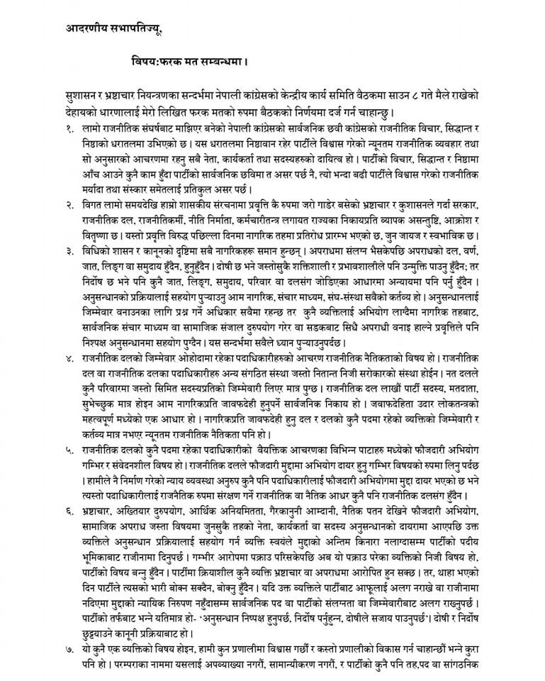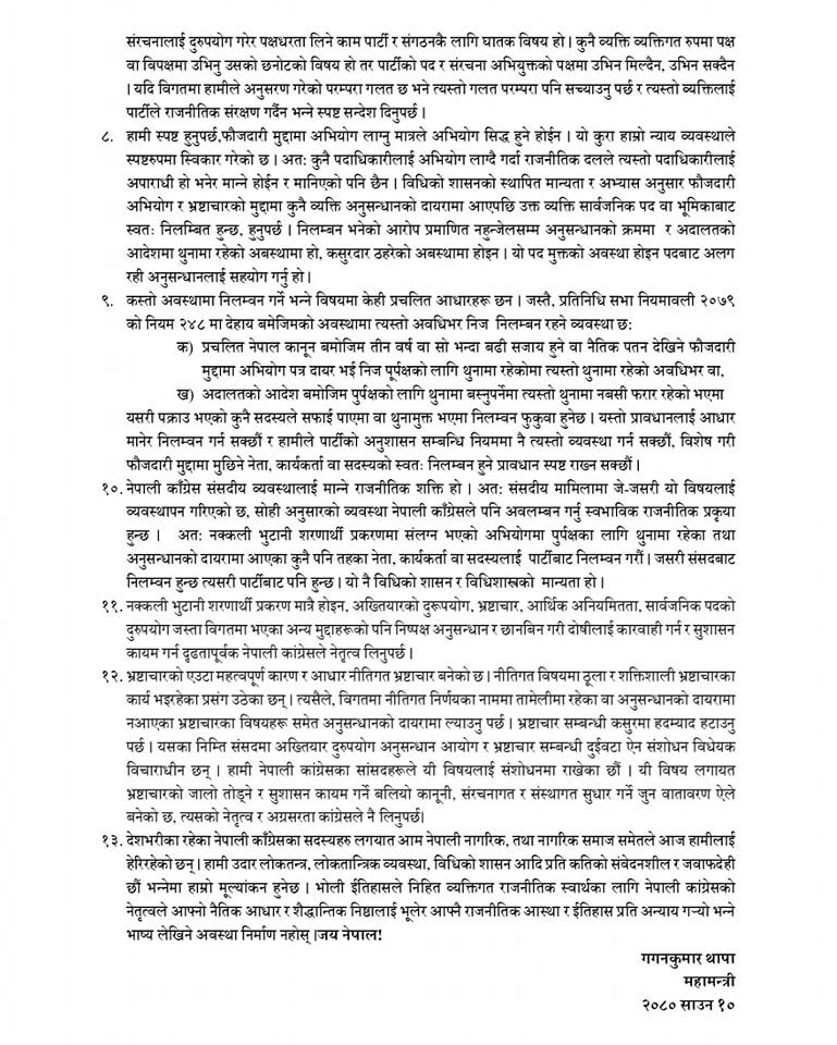 यस्तो छ महामन्त्री थापाले बुझाएको १३ बुँदे फरक मत
